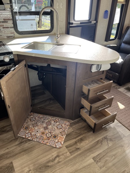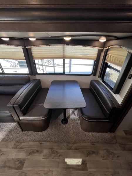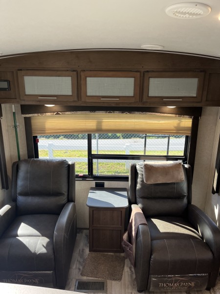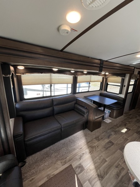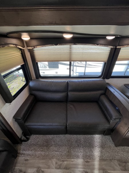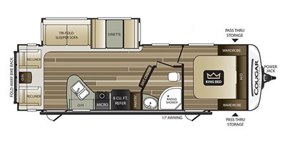 ~ NEW iN•Command™ Generation 3 with Global Connect gives owners total control over power, slides, awnings, HVAC and more ~ Climate Guard protection package – larger heating and cooling units, residential in-floor heat ducting, and increased insulation. ~ Zero-degree rated Ultra-stable and secure MORryde® Step Above™ steps ~ Interior and exterior LED lights ~ 35,000 BTU furnace and 15,000 BTU air conditioner ~ 70” x 80” standard king bed ~ Arched rafters with 84” ceiling height ~ 2” accessory hitch receiver ~ Self-adjusting brakes, reverse taillights and backup camera prep ~ Automatic leveling system ~ Walkable roof with rear-wall ladder for easy maintenance ~ KeyTV™ – A simplified multisource signal controller that distributes satellite, cable, and over-the-air feeds via a single coax cable to every television ~ NEW modern interior styling ~ Top seating, fold-flat sofa ~ Dimmable lighting ~ Furrion® range ~ 22” oven with glass cooktop cover ~ Foot-flush porcelain toilet ~ Best-in-class holding tank capacities ~ Champagne laminated side walls w/5-side aluminum superstructure ~ 3/8" walkable roof decking ~ Fiberglass front cap with Hitch Vision™ & LED lights ~ Full-size spare tire ~ Cougar vintage maple glazed hardwood cabinetry ~ 12,000 BTU rapid-recovery 6-gallon gas/electric water heater ~ Aluminum wheels ~ Battery disconnect switch ~ LED interior and exterior lighting ~ MORryde Solid Step on main entry ~ Friction hinge entry door
