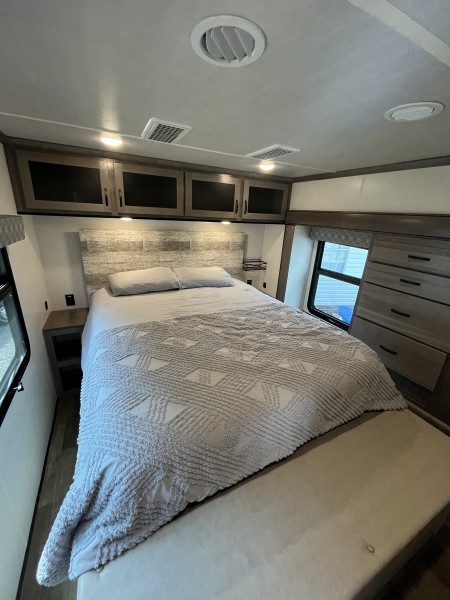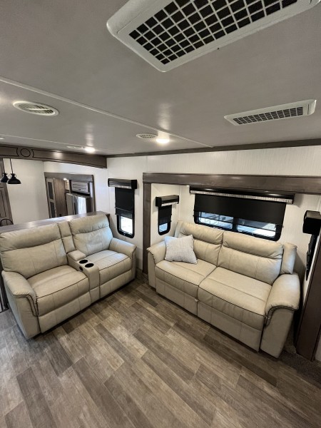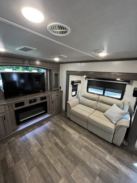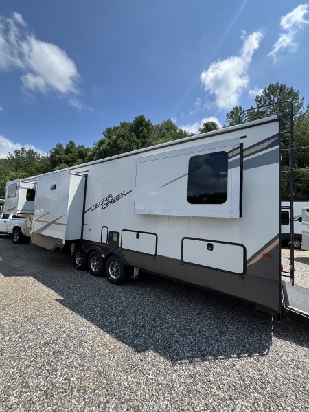 The Cedar Creek 385TH Features A Spacious Rear Garage That Offers Plenty of Room For Gear and Toys. This Unique Floorplan Has So Many Possibilities. Some Great Features That Are Included Is This Very Well Maintained Fifth Wheel Are: * Stainless Steel Refrigerator With Ice Maker And Filtered Water * Residential High Top, Swivel Kitchen Faucet With Pull Out Sprayer * Solid Surface Countertops With Stainless Steel Undermounted Sink * Stainless Steel Over The Range Microwave Oven * Backlit Medallion Over Island * Central Vacuum System With Attachments * Free Standing Table With Chairs * Day Night Shades * Variable Speed Power Vent Fan In Kitchen * Full Extension Drawer Glides * Luxury Hide A Bed Sofa * Fireplace * Lift Television In Living Room * Power Theater Seating * Congoleum Flooring * Skylight Over The Shower * Porcelain Toilet With Top Circular Flush System * Create A Breeze Circulation Fan In Bathroom * Extra Storage For Linens * Blackout Night Shades In Bedroom * LED Night Lighting Under Bath Vanity * Washer And Dryer Prep * Outside Mini Refrigerator * Outside Television * Tire Pressure Monitoring System * Back Up Camera * Automatic 6 Point Hydraulic Leveling System * Heated Storage Compartment With Diamond Tread Flooring * 5 Tier MorRyde Entry Step * 12 Gallon LP or 110 Volt Water Heater With Bypass Kit * 2 High Performance Ducted Air Conditioners * Full Docking Station With Multi Function Tank Levelers, Outside Shower, Black Tank Flush, 12 Volt Battery Disconnect * Brand New Tires So Many More Options In This Very Well Cared For Cedar Creek Toy Hauler Give Us A Call For More Information