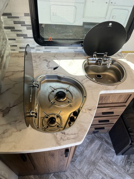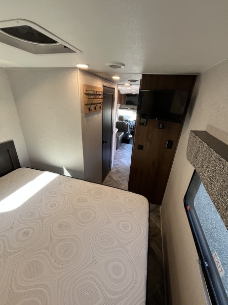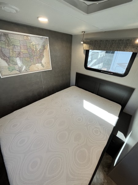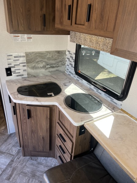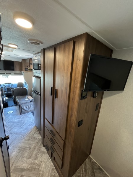 This RV is packed with premium features designed for comfort, convenience, and style. Highlights include: • Ultra-light, eco-friendly building materials • Frameless windows • Class-leading, pass-through storage • Residential style cabinetry • 12V LED TV • 5.3 Cu. ft. Eurostyle refrigerator that operates on 12V/110/LP • Undermount .9 cu. ft. convection microwave • 8” Touch screen Ford Sync radio • All enclosed bathrooms with privacy door (no wet baths) • Exterior speakers • Interior surround sound entertainment system • Truma Combi electric heat and high-efficiency water heater • Queen Sized Bed • Optional all-wheel drive • Passenger swivel seat • Back-up and side view cameras • Power awning with LED light strip.