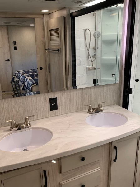 * Dual Bathroom Sinks, Step-In Glass Shower w/Seat